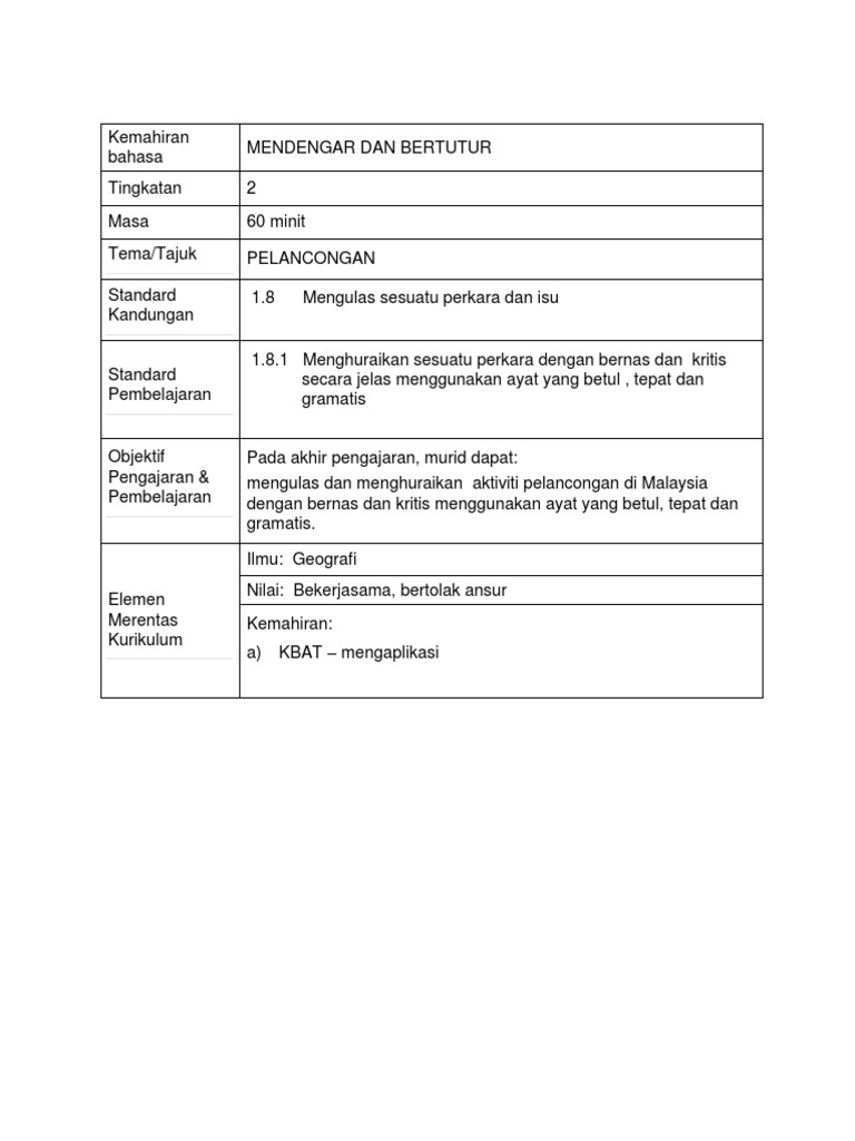 Bahasa Melayu TS25 Sains KSSM RPH Tingkatan 2. Contoh Rph Kssm Bm Ting 1 Pdf. Mendengar dan memahami maklumat dalam pelbagai ujaran dengan memberikan respons yang betul dan bertatasusila.